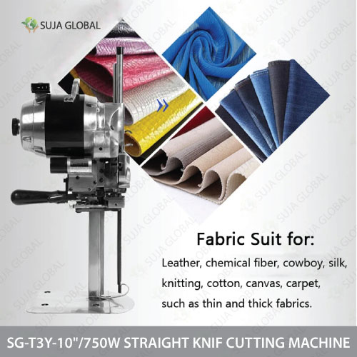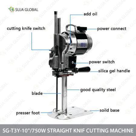 SUJA GLOBAL SG-T3Y-10″/750W Cloth Cutting Machine employs traditional mechanical rotation of the motor, gear, and directional trajectory mechanical technical principles. It incorporates a humanized design concept and selects high-quality, high-hardness wear spare parts with high precision, utilizing advanced technology processes and quality system management methods. The machine ensures cutting performance that is more wear-resistant, with reduced resistance and automatic sharpening for extended life. It boasts high cutting efficiency, high power, low noise, and minimal vibration, producing straight and smooth incisions. Additionally, it operates smoothly, offers strong safety features, and is easy to operate. The machine’s elegant appearance makes it suitable for a variety of industries, including clothing, textiles, luggage, leather, bedding, and others, as an ideal fabric cutting equipment.